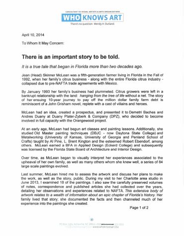 Last summer, McLean hired me to assess the artwork and discuss her plans to make the work, as well as the story, public. During my visit to her Charlotte area studio in June 2013, I examined 18 of the paintings. I also saw the carefully preserved volumes of notes, correspondence and published articles she had collected over the years, detailing her observations and experiences related to NAFTA. This extensive body of artwork relates to a wealth of information about an epic chapter of Florida's history. Her family lived that story; she documented the facts and then channeled much of her experience into the paintings she created.