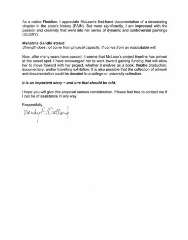 As a native Floridian, I appreciate McLean's first-hand documentation of a devastating chapter in the state's history (PAIN). But more significantly, I am impressed with the passion and creativity that went into her series of dynamic and controversial paintings